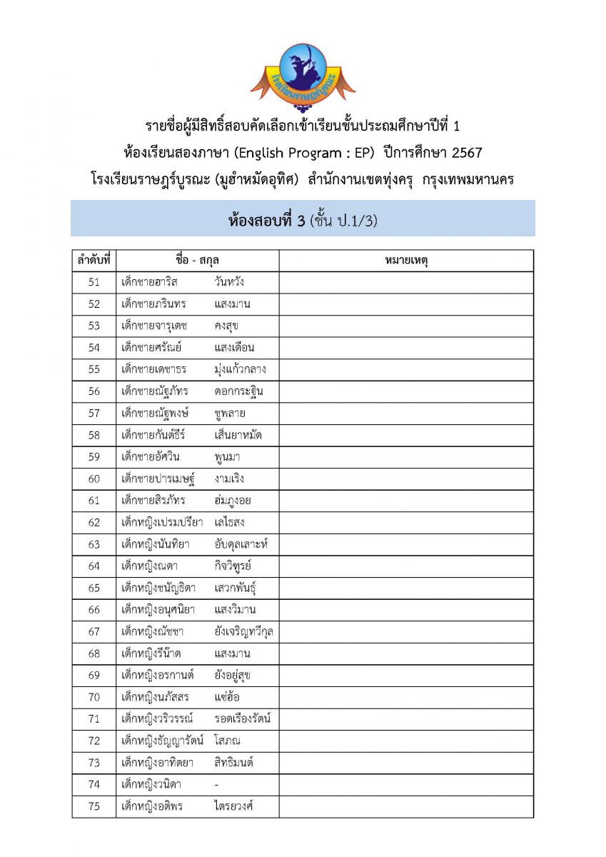 ประกาศรายชื่อนักเรียนที่มีสิทธิ์เข้าสอบคัดเลือกเข้าเรียนห้องเรียน English Program (EP) ระดับชั้นประถมศึกษาปีที่ 1 ปีการศึกษา 2567 ในวันอาทิตย์ที่ 10 มีนาคม 2567 เวลา 8.00 น. - 12.00 น. โรงเรียนราษฎร์บูรณะ(มูฮำหมัดอุทิศ) สำนักงานเขตทุ่งครุ กรุงเทพมหานคร