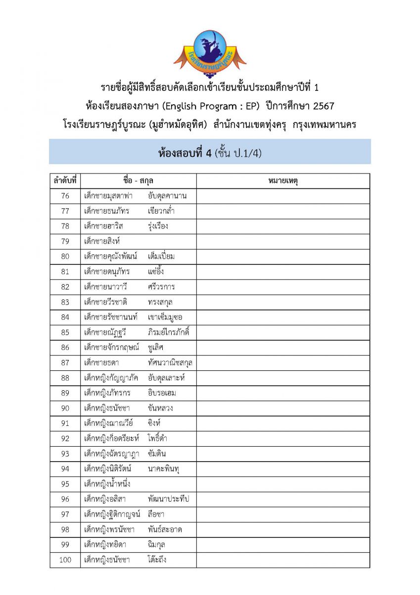 ประกาศรายชื่อนักเรียนที่มีสิทธิ์เข้าสอบคัดเลือกเข้าเรียนห้องเรียน English Program (EP) ระดับชั้นประถมศึกษาปีที่ 1 ปีการศึกษา 2567
