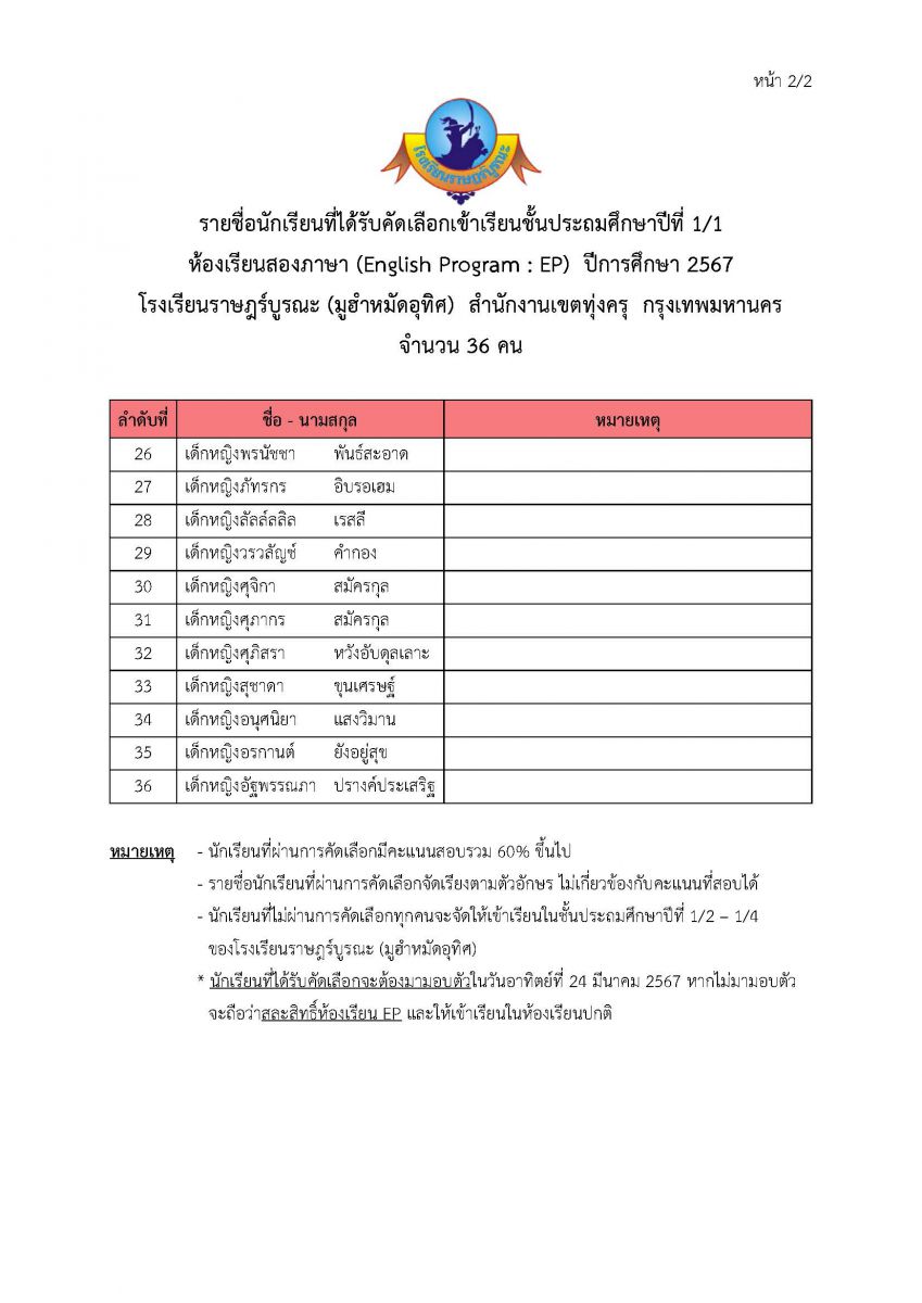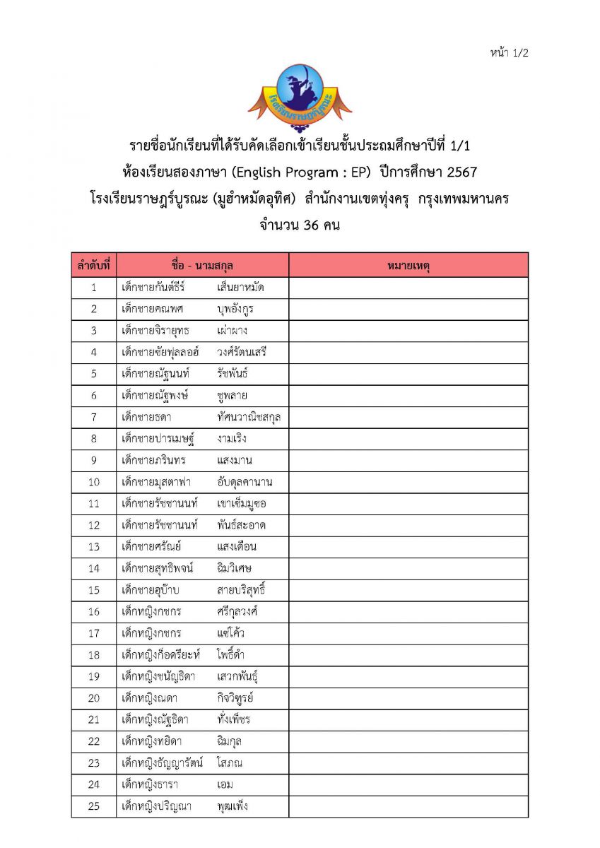 ประกาศรายชื่อนักเรียนที่ผ่านการสอบคัดเลือกเข้าเรียนห้องเรียนสองภาษา English Program (EP) ระดับชั้นประถมศึกษาปีที่ 1 ปีการศึกษา 2567