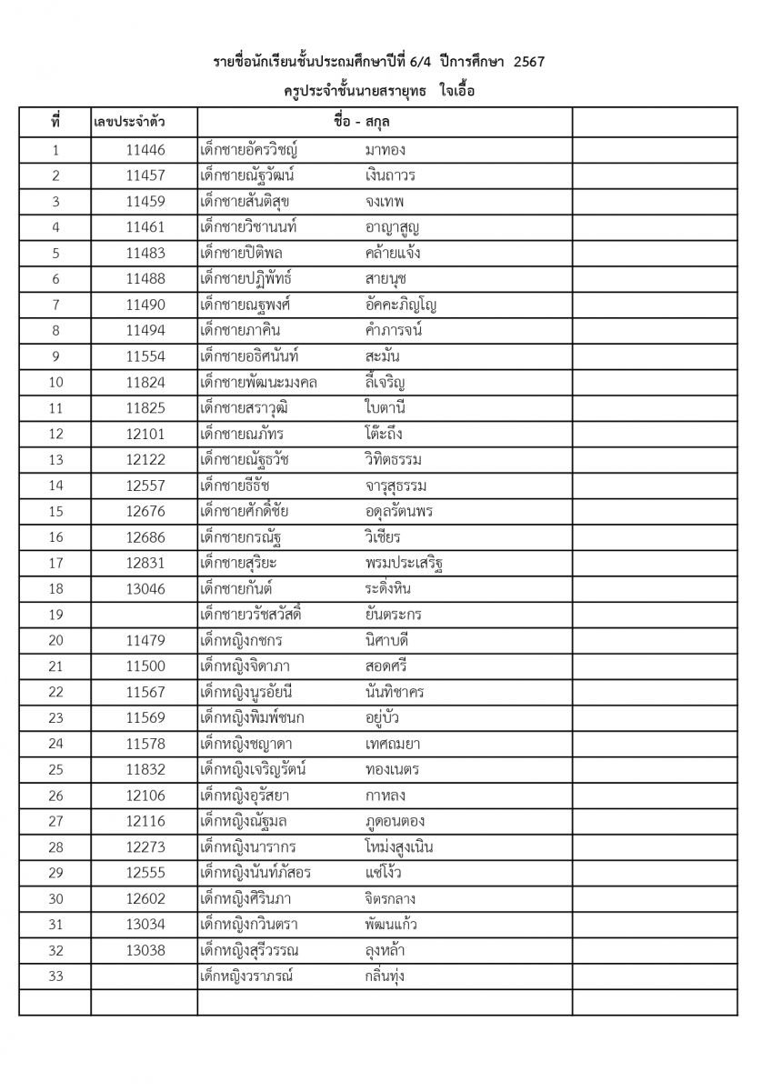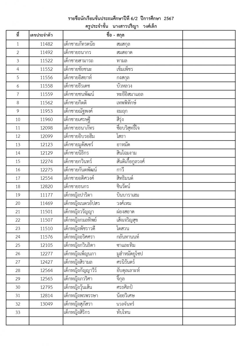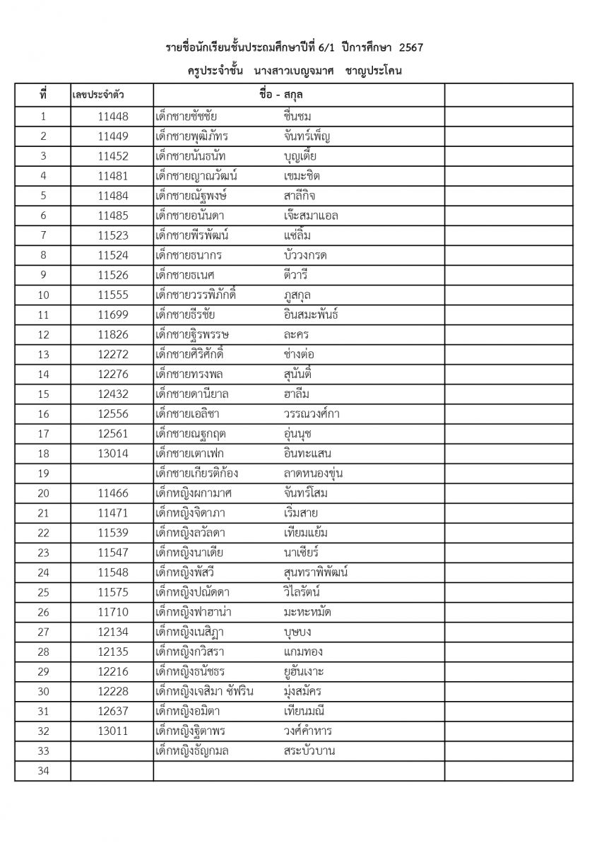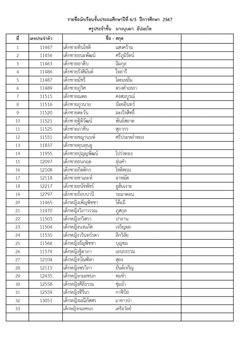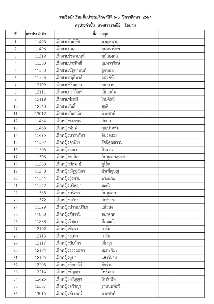 รายชื่อนักเรียนระดับชั้นประถมศึกษาปีที่ 6 ปีการศึกษา 2567