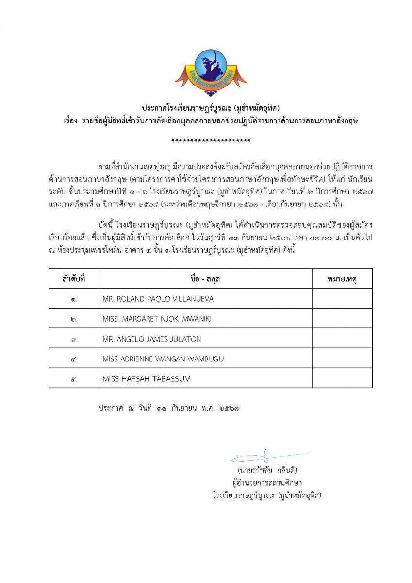 ประกาศรายชื่อผู้มีสิทธิ์เข้ารับการคัดเลือกบุคคลภายนอกช่วยปฏิบัติราชการด้านการสอนภาษาอังกฤษ โรงเรียนราษฎร์บูรณะ(มูฮำหมัดอุทิศ)