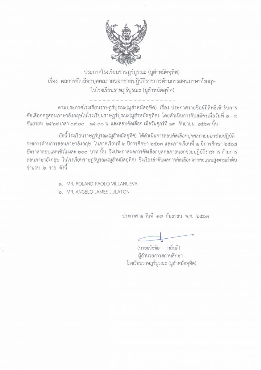 ประกาศรายชื่อบุคคลภายนอกที่ได้รับการคัดเลือกช่วยปฏิบัติราชการด้านการสอนภาษาอังกฤษ โรงเรียนราษฎร์บูรณะ(มูฮำหมัดอุทิศ)