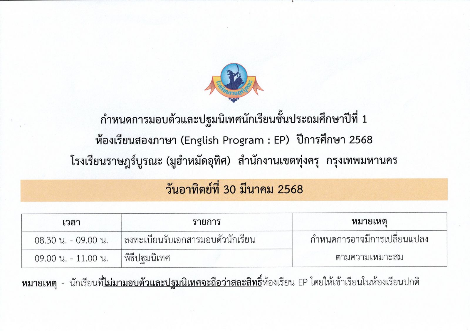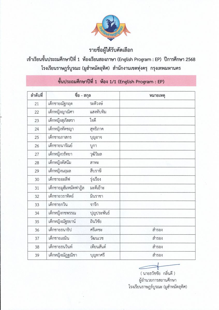 ประกาศรายชื่อนักเรียนที่ได้รับคัดเลือกเข้าเรียนชั้นประถมศึกษาปีที่ 1 ห้องเรียนสองภาษา (English Program : EP) ปีการศึกษา 2568