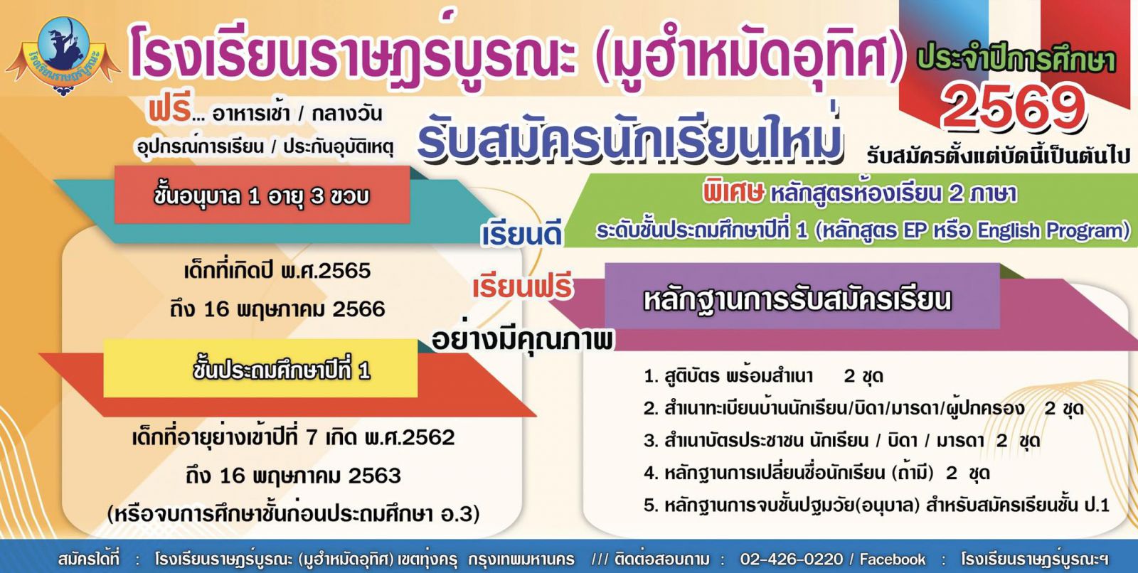 ประกาศโรงเรียนราษฎร์บูรณะ(มูฮำหมัดอุทิศ) รับสมัครนักเรียนใหม่ประจำปีการศึกษา 2569