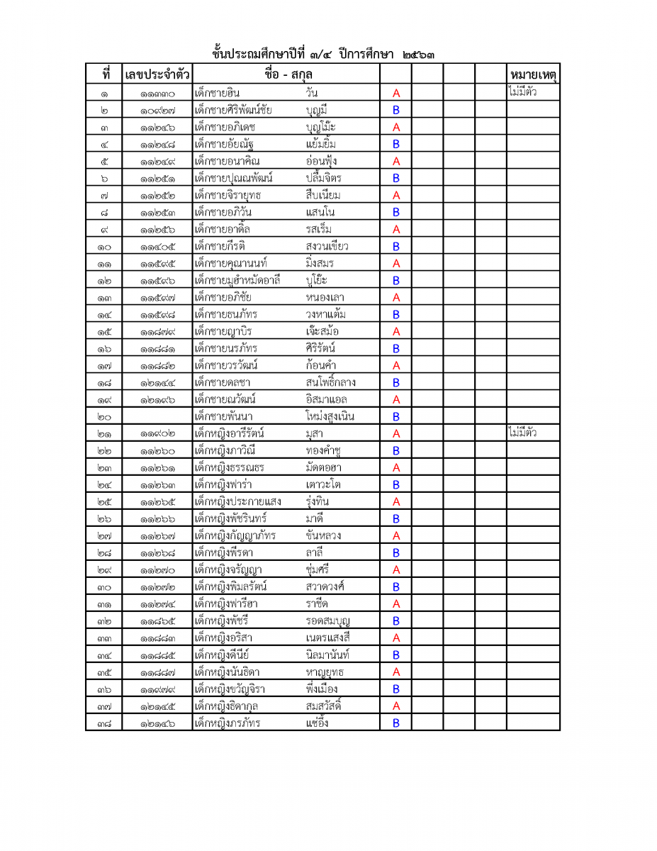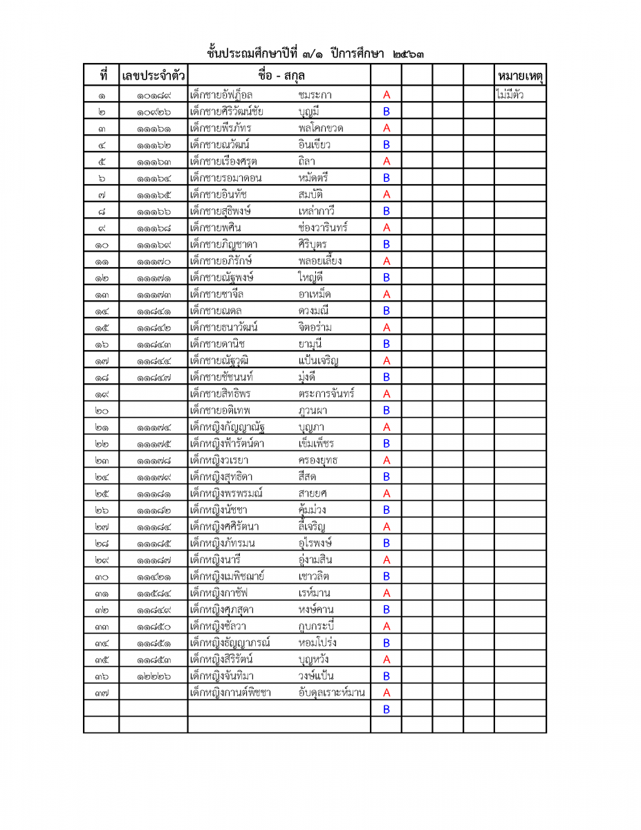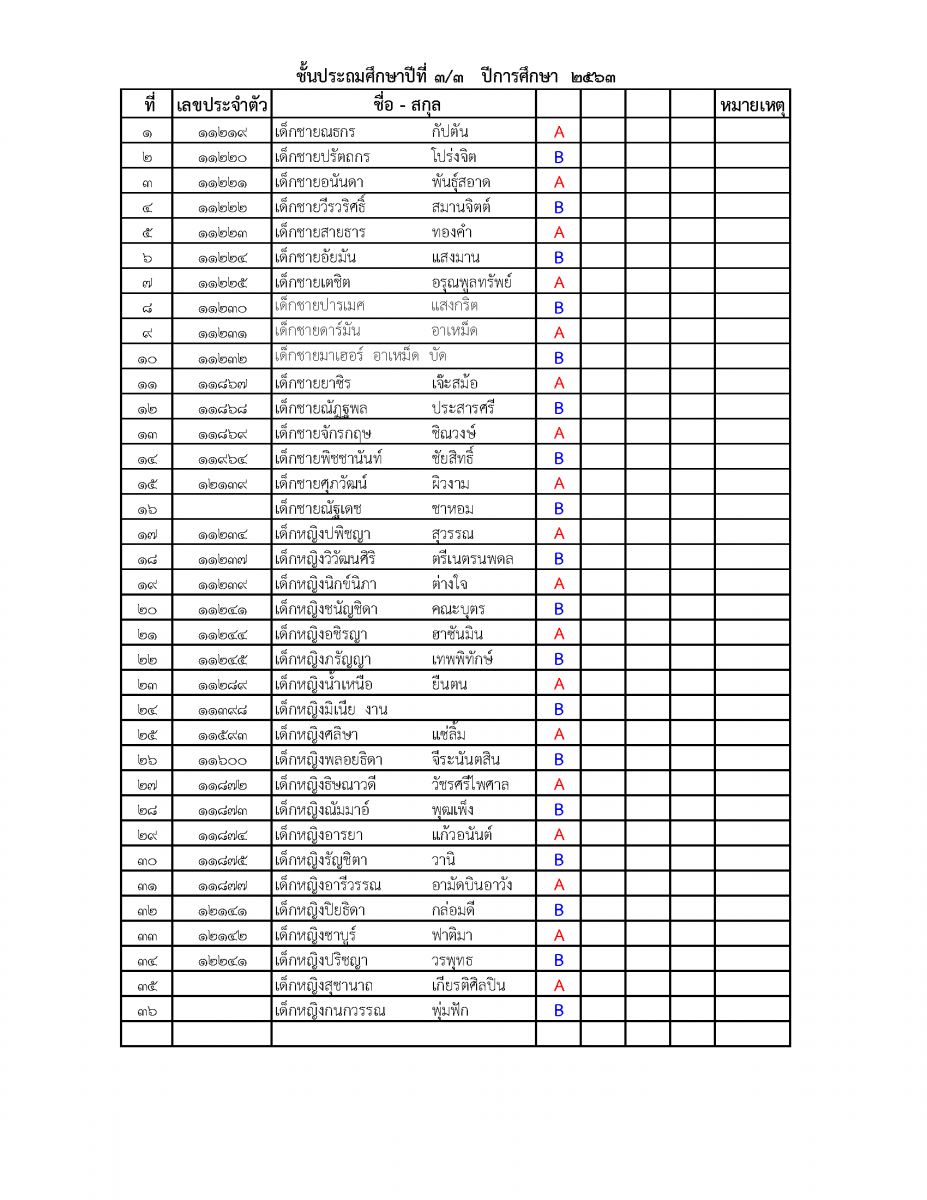 รายชื่อการแบ่งกลุ่มนักเรียนชั้นประถมศึกษาปีที่ 3 โดยสลับมาเรียนแบบวันเว้นวัน ในเปิดภาคเรียน วันที่ 1 กรกฎาคม จะเป็นนักเรียนกลุ่ม A และวันต่อไปจะเป็นนักเรียนกลุ่ม B ซึ่งจะสลับกันมาเรียน สำหรับผู้ปกครองที่มีข้อสงสัยหรือต้องการเปลี่ยนแปลงกลุ่มของนักเรียนเพื่อความเหมาะสมให้ติดต่อประสานกับครูประจำชั้น