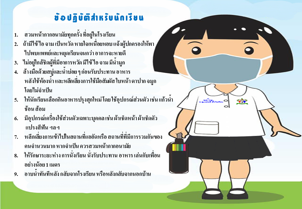 - นักเรียนทุกคนจะต้องสวมหน้ากากอนามัยหรือหน้ากากผ้าทุกคน โดยทางโรงเรียนไม่จำกัดสีหรือรูปแบบให้ผู้ปกครองจัดหาได้ตามความสะดวกและเหมาะสมและให้ทำเครื่องหมายหรือชื่อเพื่อป้องกันการหายหรือสลับกัน