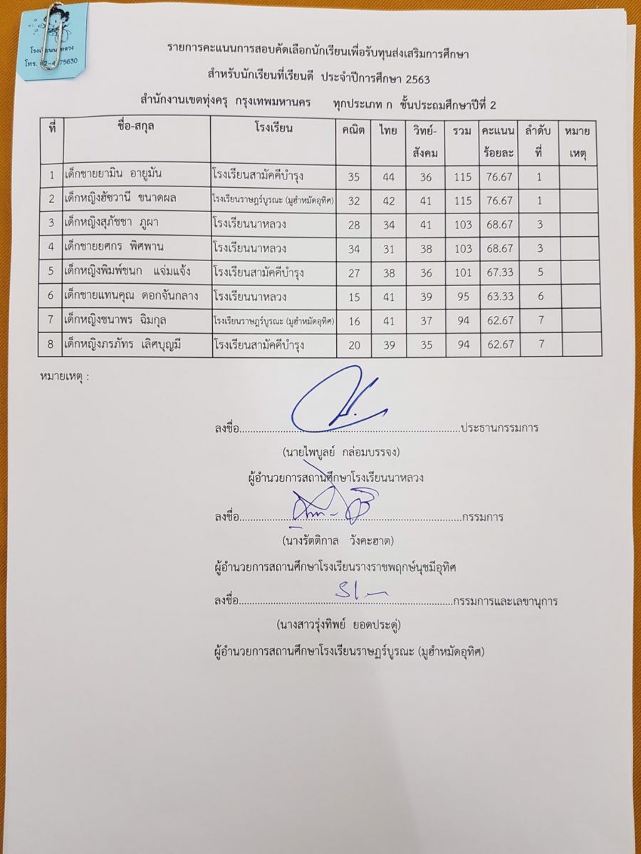 ผลการสอบชิงทุนการศึกษากรุงเทพมหานคร ปีการศึกษา 2563 ระดับชั้นประถมศึกษาปีที่ 2 จำนวน 8 ทุน