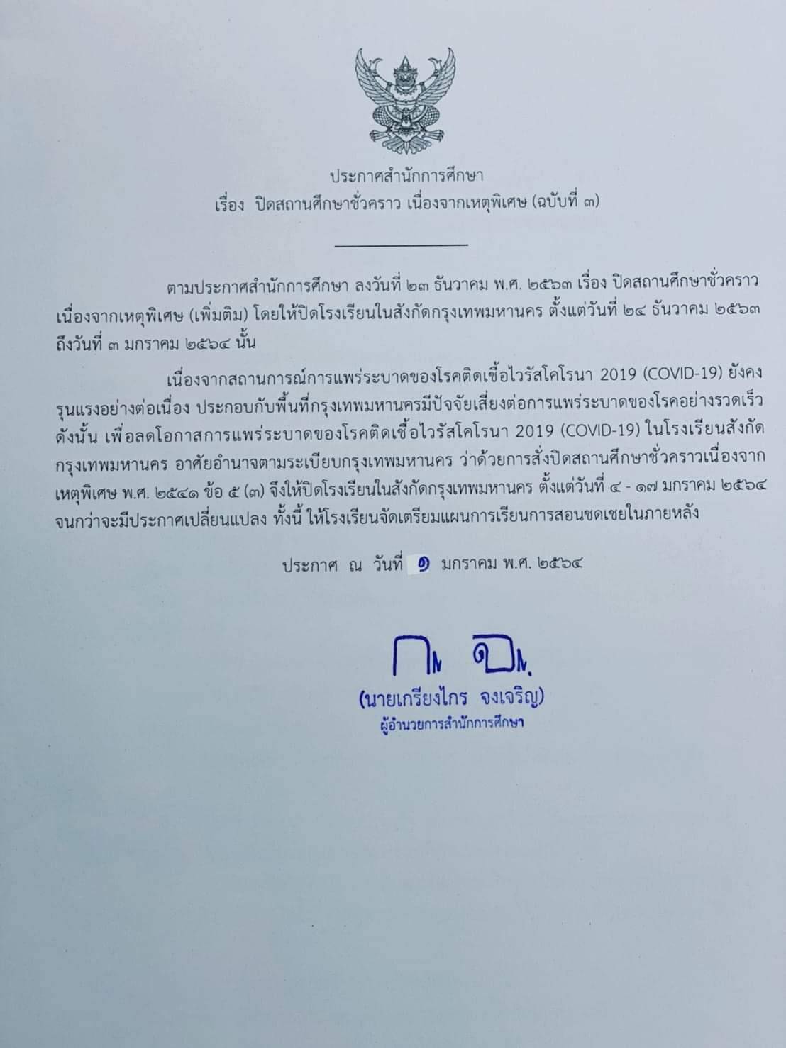 เนื่องจากการแพร่ระบาดของเชื้อไวรัสโคโรน่า (โควิด 19) ยังมีการระบาดอย่างต่อเนื่องและรุนแรง ดังนั้นเพื่อลดการแพร่ระบาดของเชื้อโรคในโรงเรียนสังกัดกรุงเทพมหานคร จึงให้ปิดเรียนตั้งแต่ วันที่ 4 -17 มกราคม 2564 จนกว่าจะมีการเปลี่ยนแปลง