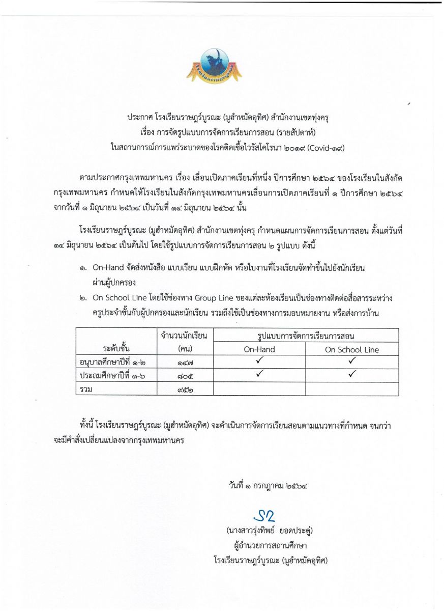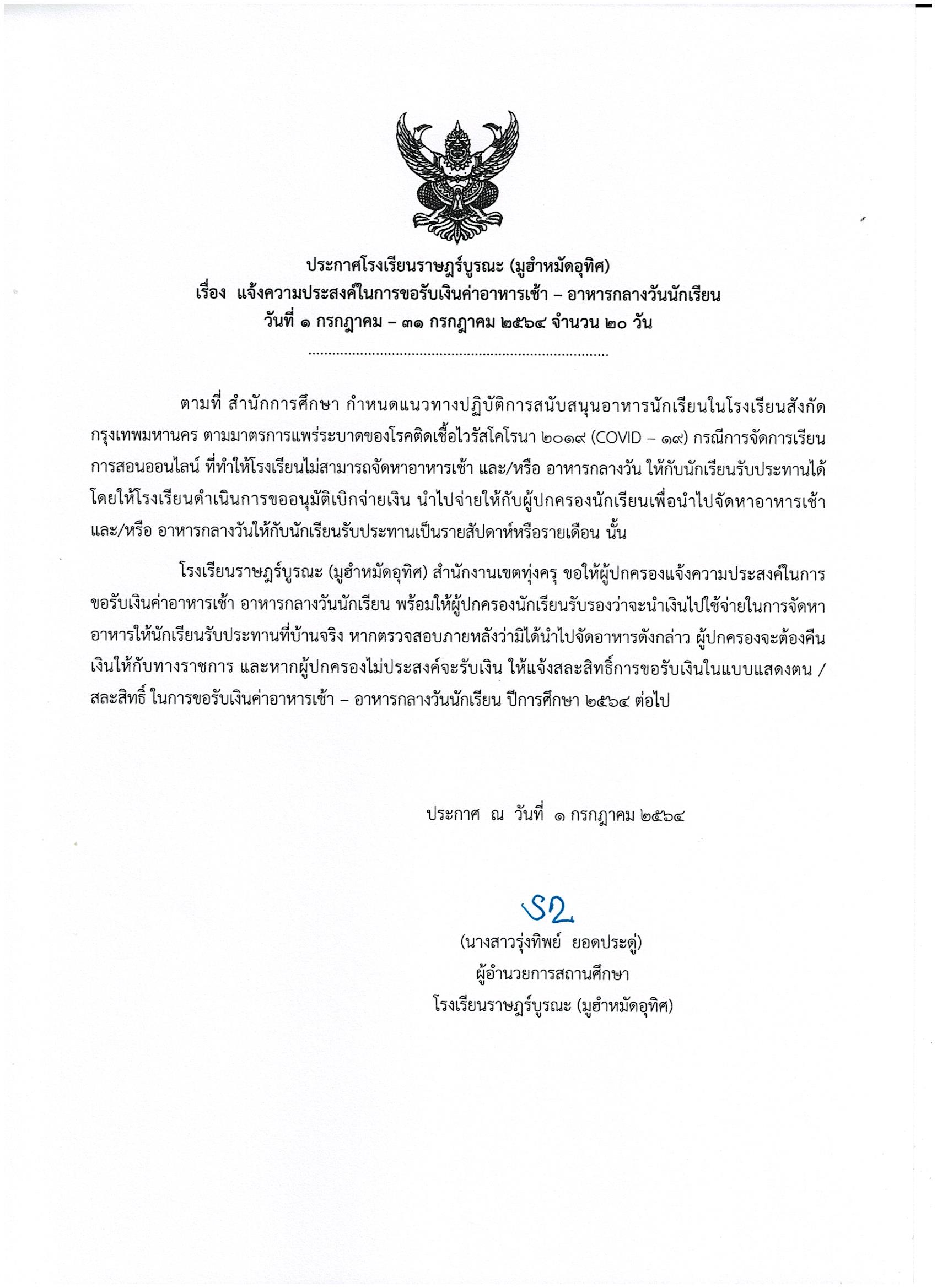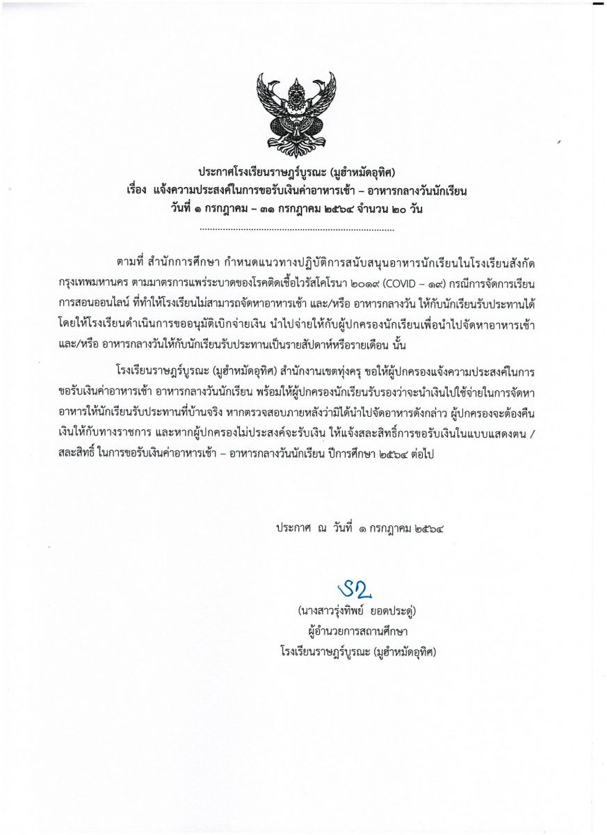ประกาศโรงเรียน เรื่อง การรับค่าอาหารนักเรียน ในช่วงเรียนระบบออนไลน์ เดือนกรกฎาคม 2564