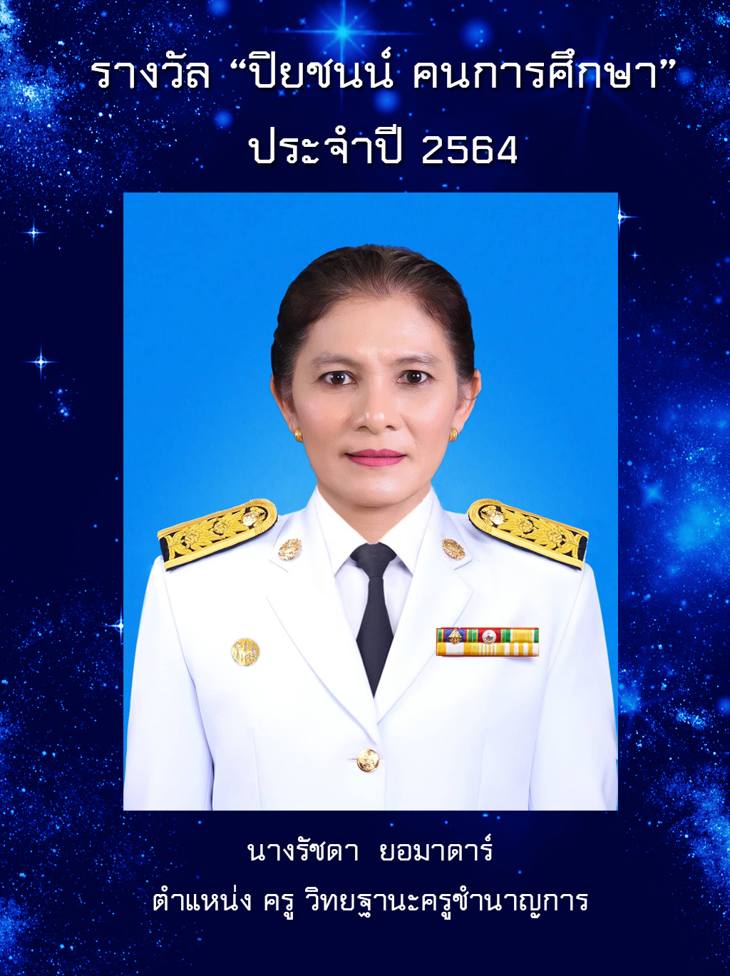 ขอแสดงความชื่นชมและยินดีกับ นางรัชดา ยอมาดาร์ ครู วิทยฐานะครูชำนาญการ ในโอกาสที่ได้รับรางวัล? ปิยชนน์ คนการศึกษา? ประจำปี 2564
