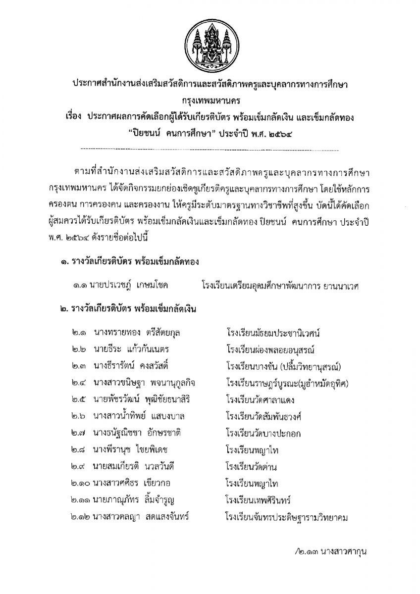 โดยสำนักงานส่งเสริมสวัสดิการและสวัสดิภาพครูและบุคลากรทางการศึกษา กรุงเทพมหานคร ทางโรงเรียนขอแสดงความชื่นชมและยินดีมา ณ โอกาสนี้